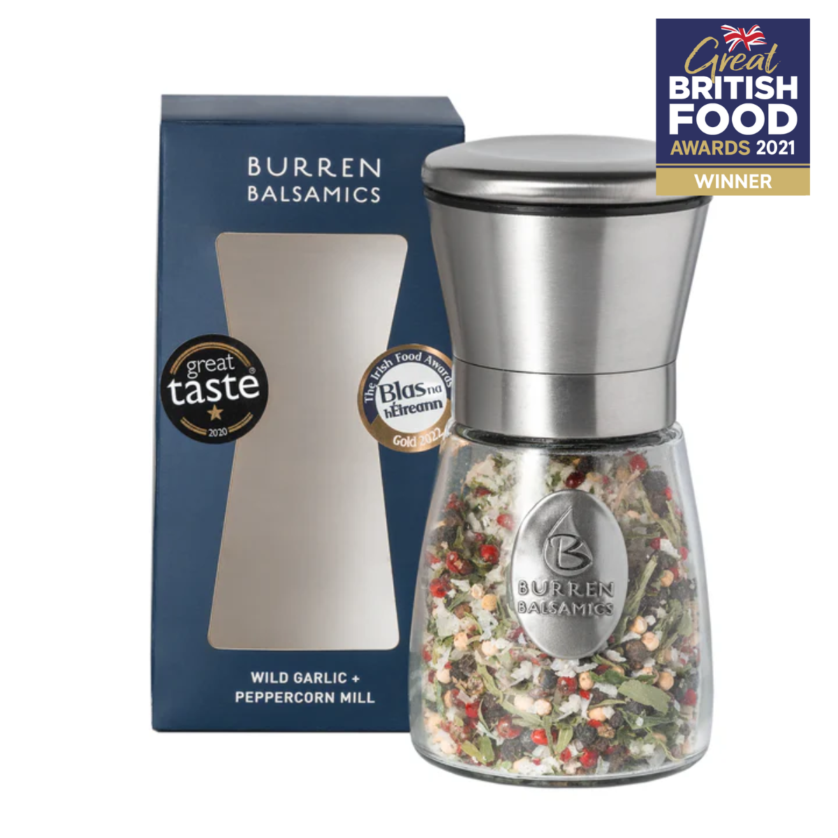 This Peppermill is a must-have ingredient to sit next to your stove while cooking this festive season. Full of the fresh flavours of Spring and the colours of Christmas. Foraged Wild Garlic is blended with flaked sea salt, and pink, black and white peppercorns.